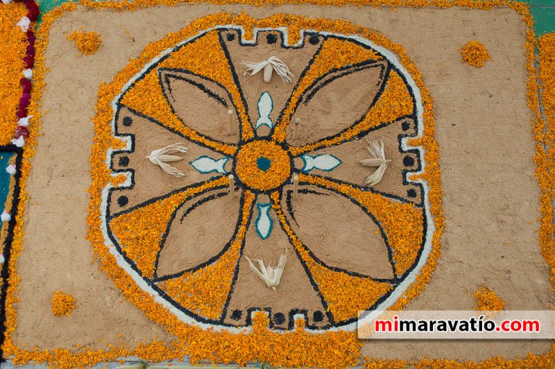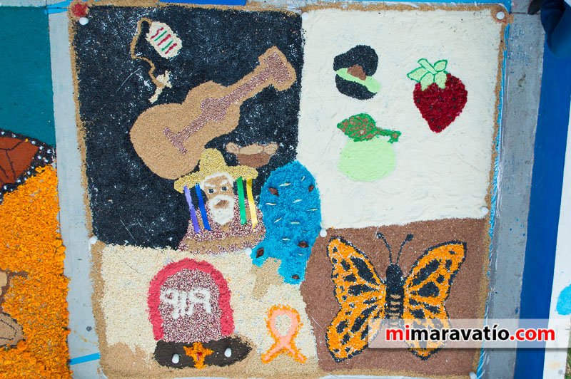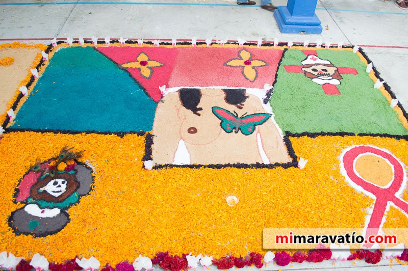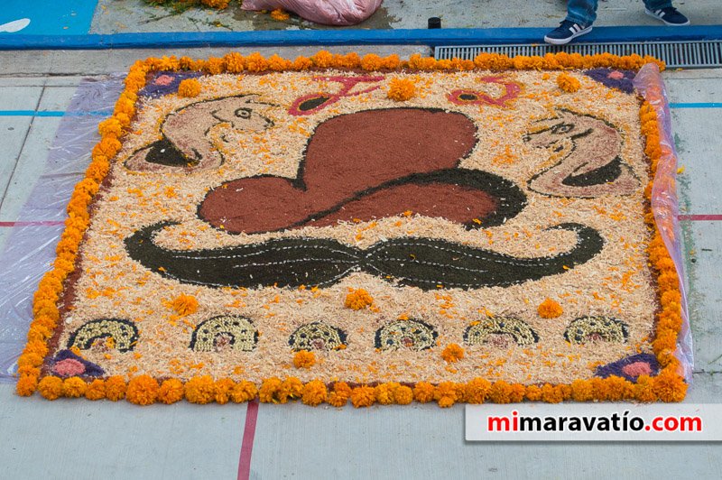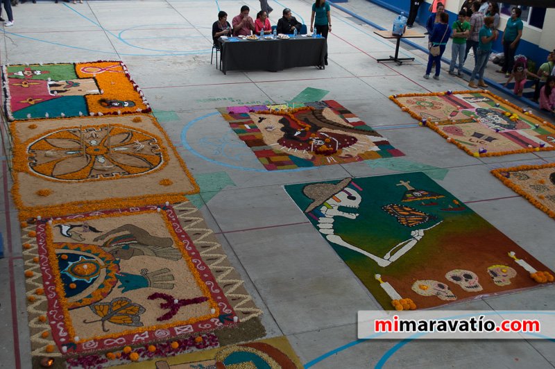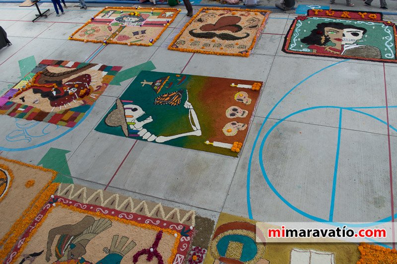 Bajo la supervisión de los maestros, los alumnos usaron su creatividad para la elaboración de los tapetes, usando distintos materiales como gises, aserrín de colores, semillas (frijol, arroz y girasol) flores, pan de muerto, veladoras, según el tipo o el lugar que representaran. Se realizaron algunos tapetes alusivos utilizando figuras como calaveras, catrinas y en otros como la figura de María Félix y Agustin Lara.